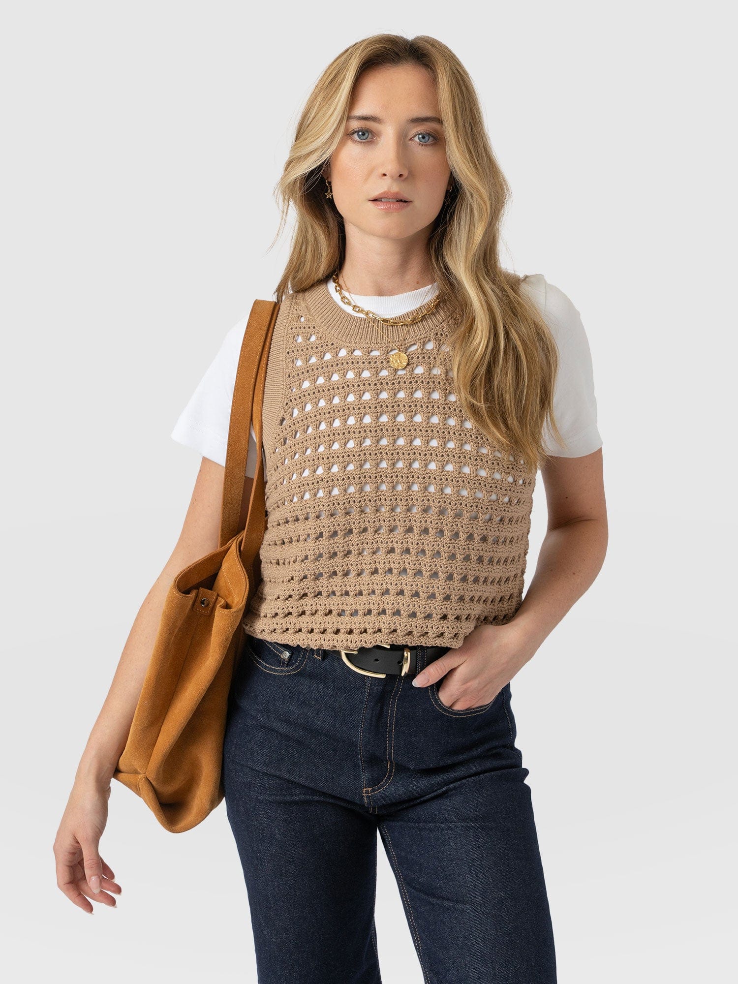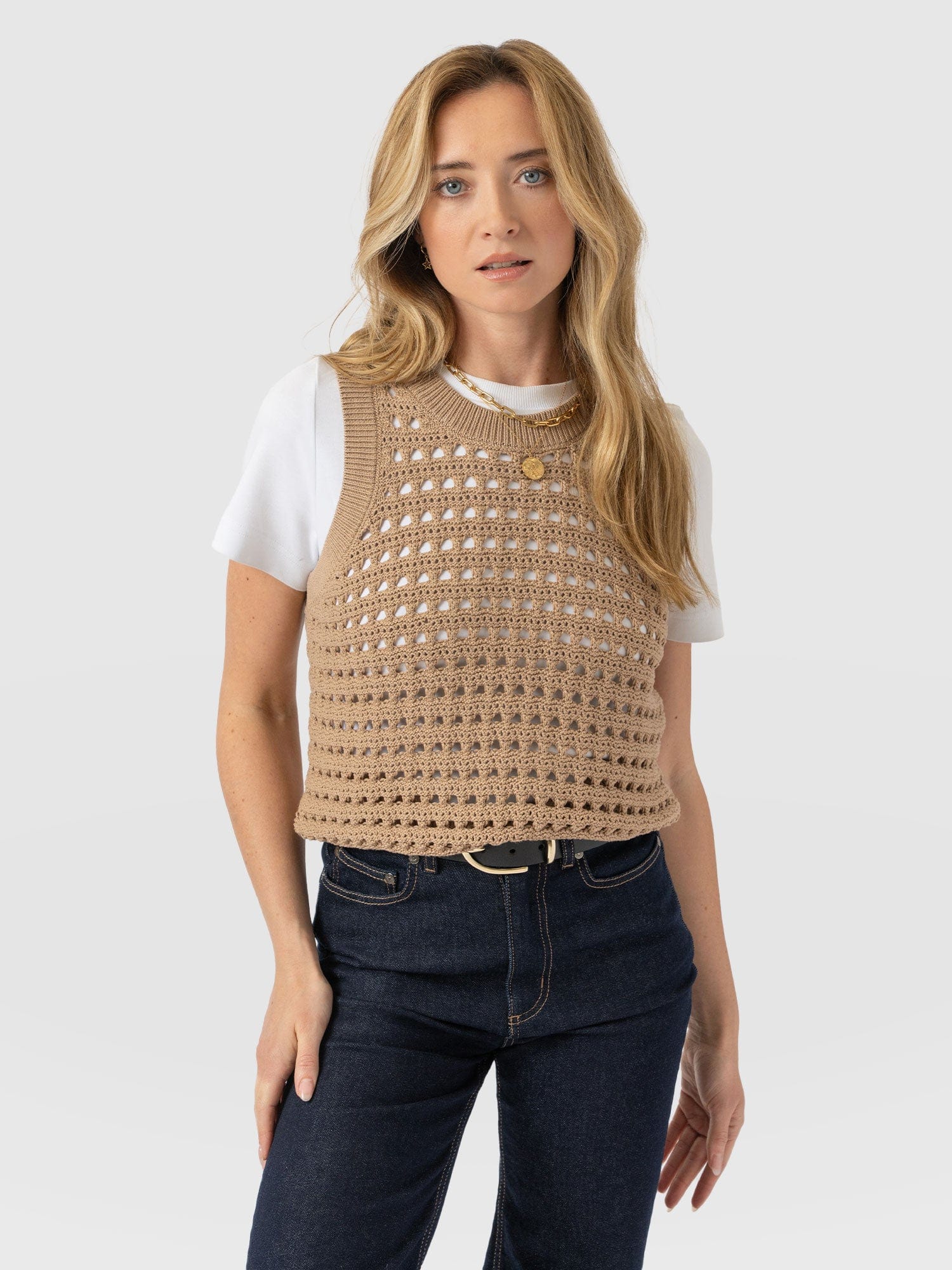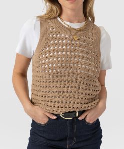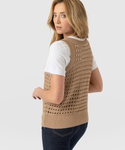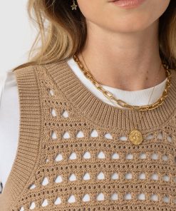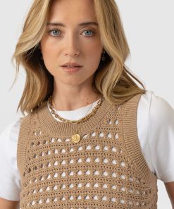 Built for layering, the Adler Sleeveless Knit in camel is perfect for those transitional months. It’s woven to an open-knit that creates a lace hole mesh texture and is cut to a sleeveless silhouette to leave the arms of your undershirt on show. Style yours with a white button-up and a pair of Maeva Skinny jeans, and let the ribbed hem cinch your waist.