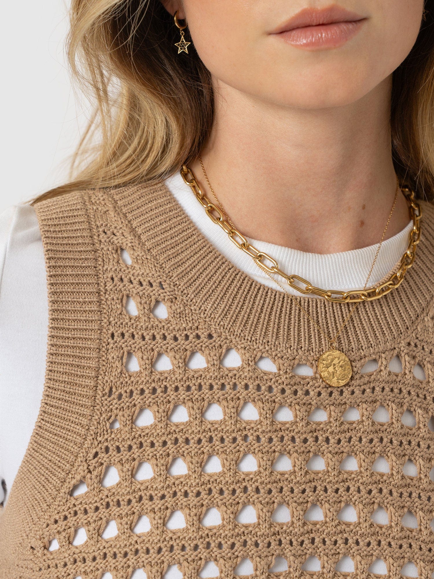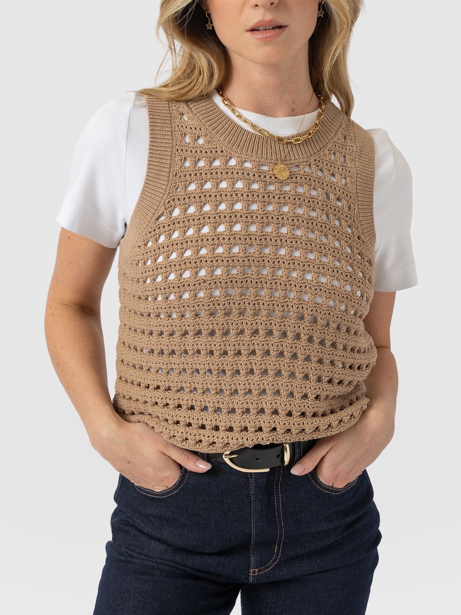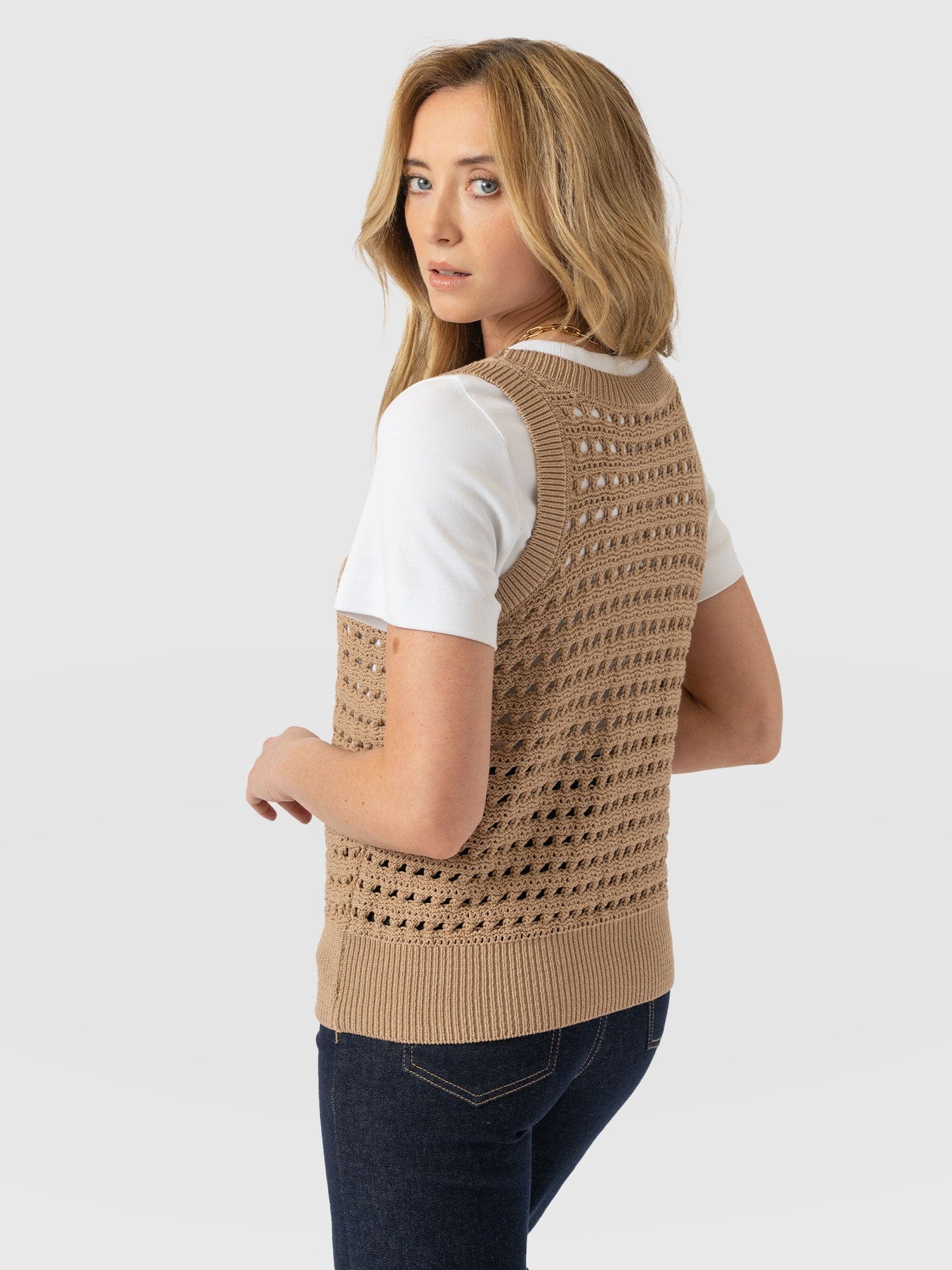 Built for layering, the Adler Sleeveless Knit in camel is perfect for those transitional months. It’s woven to an open-knit that creates a lace hole mesh texture and is cut to a sleeveless silhouette to leave the arms of your undershirt on show. Style yours with a white button-up and a pair of Maeva Skinny jeans, and let the ribbed hem cinch your waist.