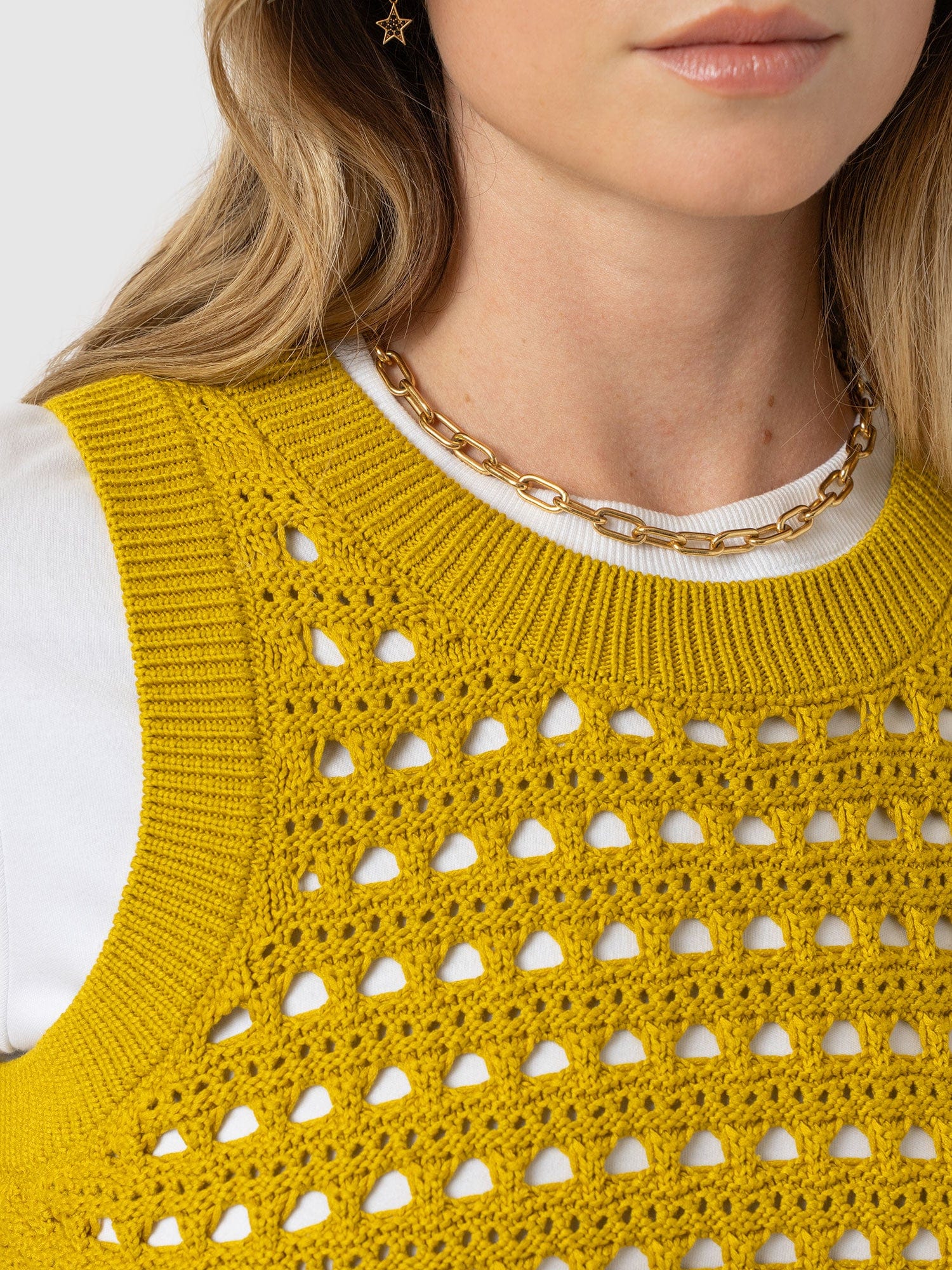 Built for layering, the Adler Sleeveless Knit in mustard is perfect for those transitional months. It’s hand woven to an open-knit that creates a comfortable, lace hole mesh texture and is cut to a sleeveless shape to leave the arms of your undershirt on show. Style yours with a white button-up and a pair of Maeva Skinny jeans, and let the ribbed hem cinch your waist.