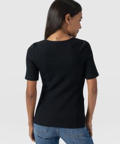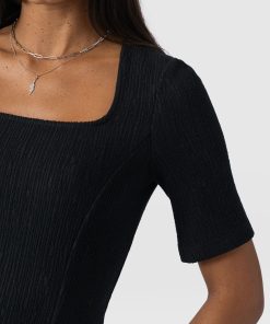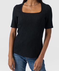 Handmade using stretch-infused organic cotton, the Akia Short Sleeve Tee in black is the perfect elevated basic to add to your wardrobe. It’s stitched to a slim-fitting silhouette with a square neckline and short sleeves. But for added interest, the entire bodice is lightly textured with subtle details. Wear yours with skirts, pants, or your favourite jeans and dress up with heels when you’re heading out under the moonlight.