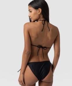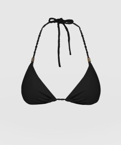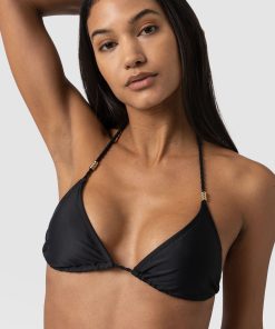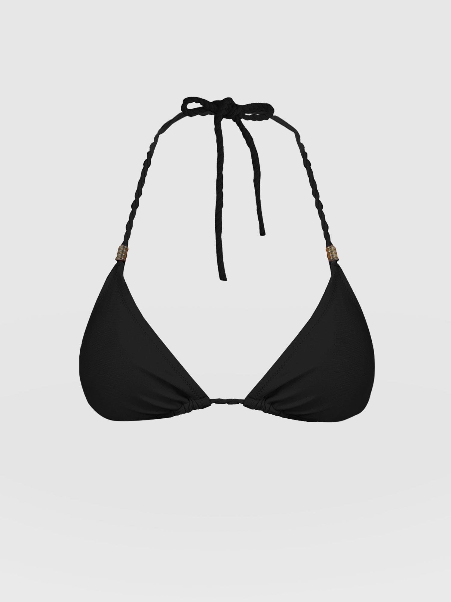 A triangle-cup bikini top with adjustable ties at the back and a halter neckline, the Alba top in black is the perfect match for the Alba Tie Side Bikini Bottom. It features braided straps to add a hint of texture and gold-toned metal detailing for a dusting of glimmer. Each style is stitched by hand to ensure the highest quality and uses recycled polyamide for a planet-friendly finish. Wear yours on beach days or pool parties with a floral cover-up and a wide-brim sun hat to complete the look.