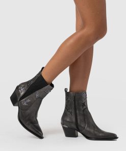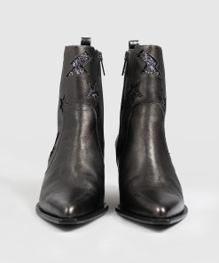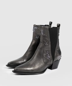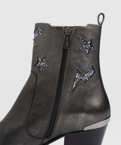 Stride with confidence and stomp with a rock-and-roll edge in our new Billie Rock Boots. This statement pair is masterfully sculpted by hand using Portuguese leather and decorated with glitter-embellished stars and lightning bolts for a glimmering edge. Then, to amp up the shine, it’s dusted in a metallic coating that’s designed to uniquely age as you wear them to create a truly vintage leather finish.