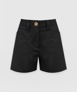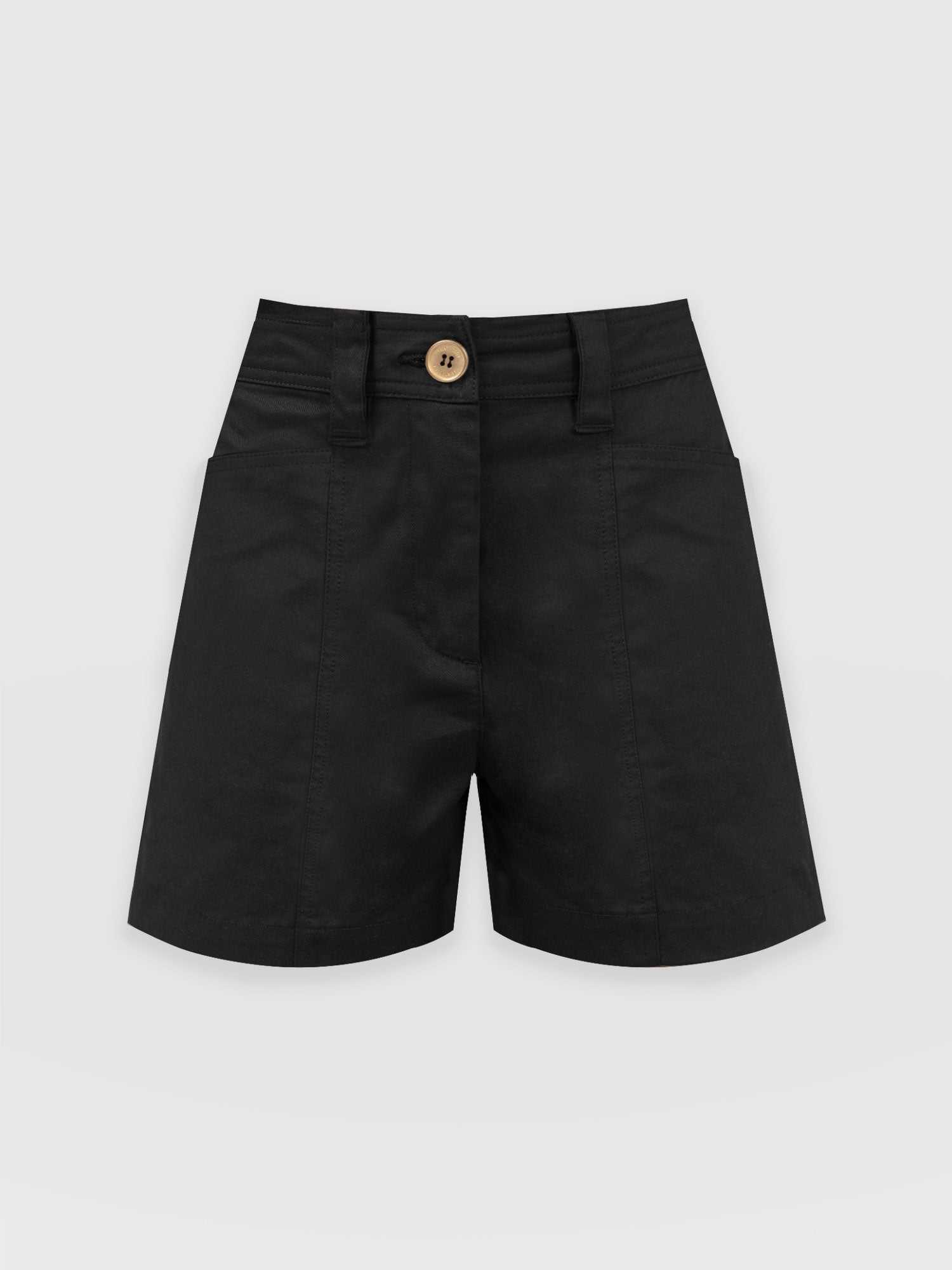 A sophisticated short in black, perfect for a casual yet stylish look. Made with high-quality cotton elastane, these mid-waisted shorts feature stitch detailing on the front and darts on the back for a flattering fit. The front pockets add a practical element while the zip fly closure with branded gold buttons adding a touch of elegance. These shorts are versatile and can be paired with any top for a comfortable and effortless outfit. Dress them up with heels or dress them down with sneakers.