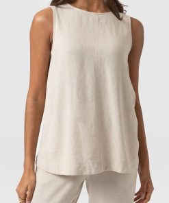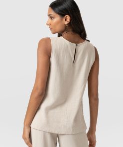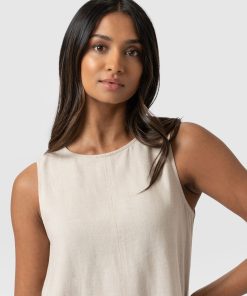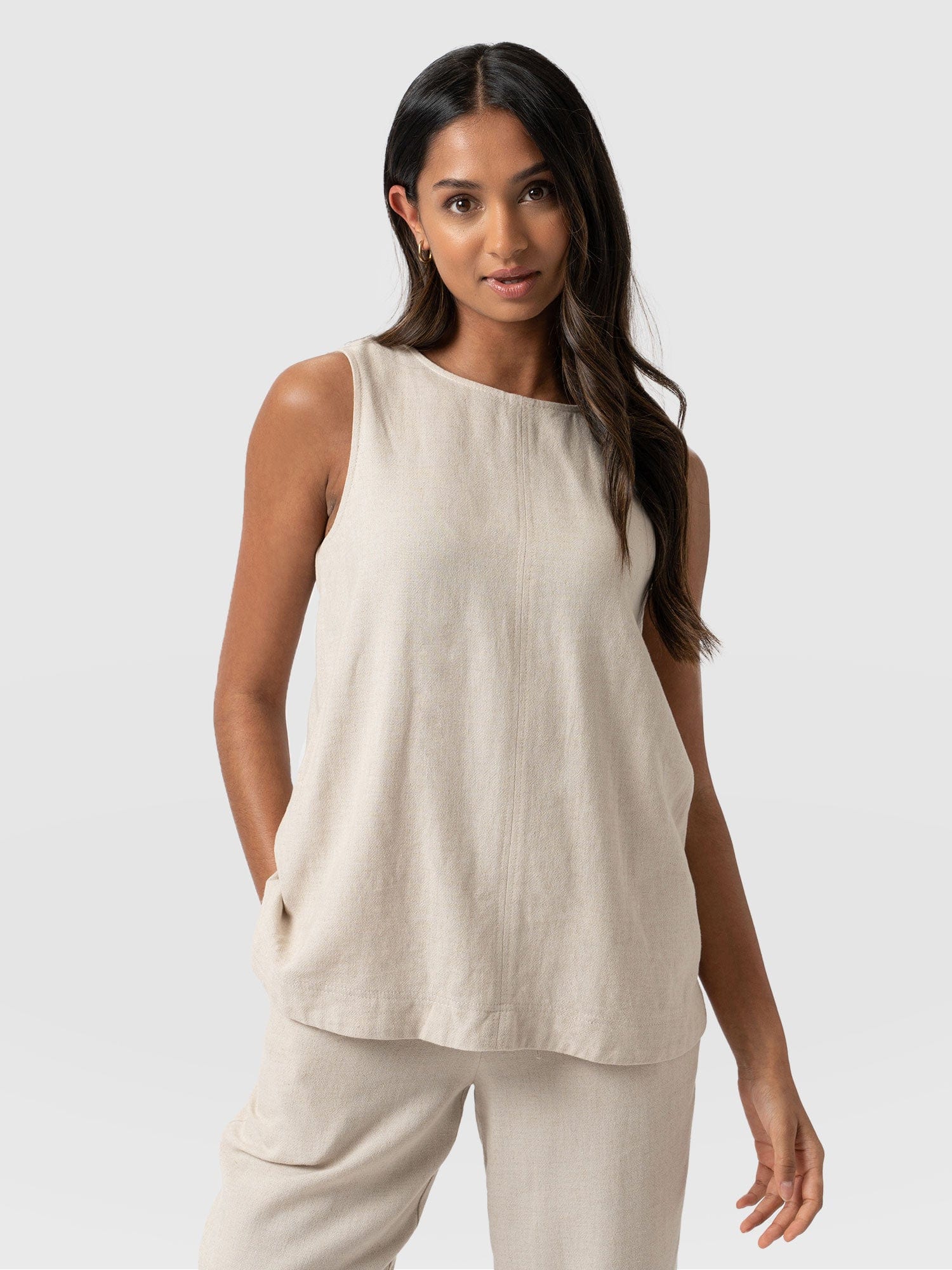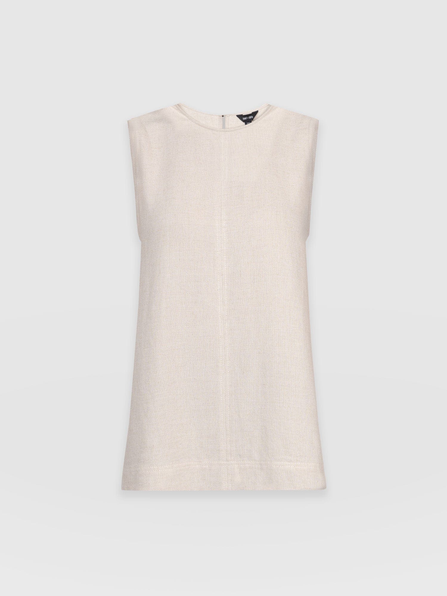 A linen blend tunic in oatmeal, the perfect addition to your summer wardrobe. This tunic top features a classic crew neck and a slight trapeze fit for a comfortable and flattering silhouette. The oatmeal linen fabrication adds a touch of sophistication to the sleeveless design. Style this versatile top with the matching Corinne Pant for a coordinated look that’s perfect for a relaxed coastal look, or dress it down with a pair of jeans and sneakers for a street style look.