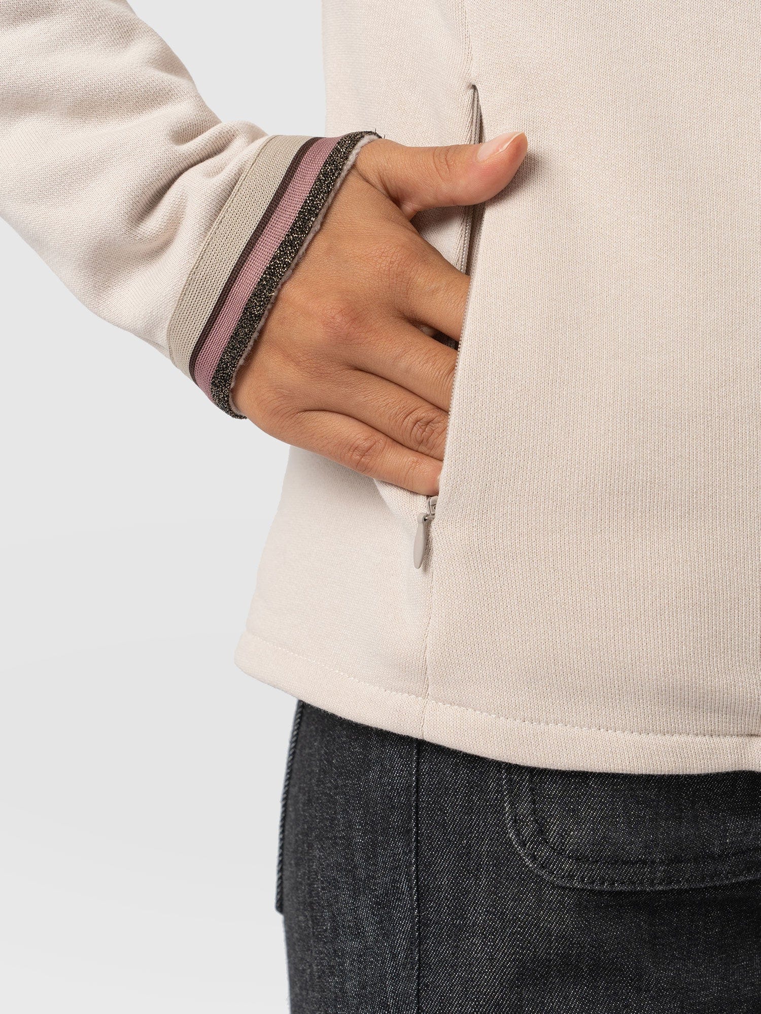 A comfortable cotton biker jacket in cream with a lurex stripe detail that’s hand made with the softest, organic cotton. Each jacket is hand made to have a relaxed shape that can be worn open or closed with an easy to use zipper. We make each style in our studios in Europe and finish every detail by hand. Wear it for work or weekends and pair it with jeans or pants.