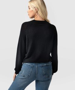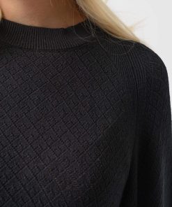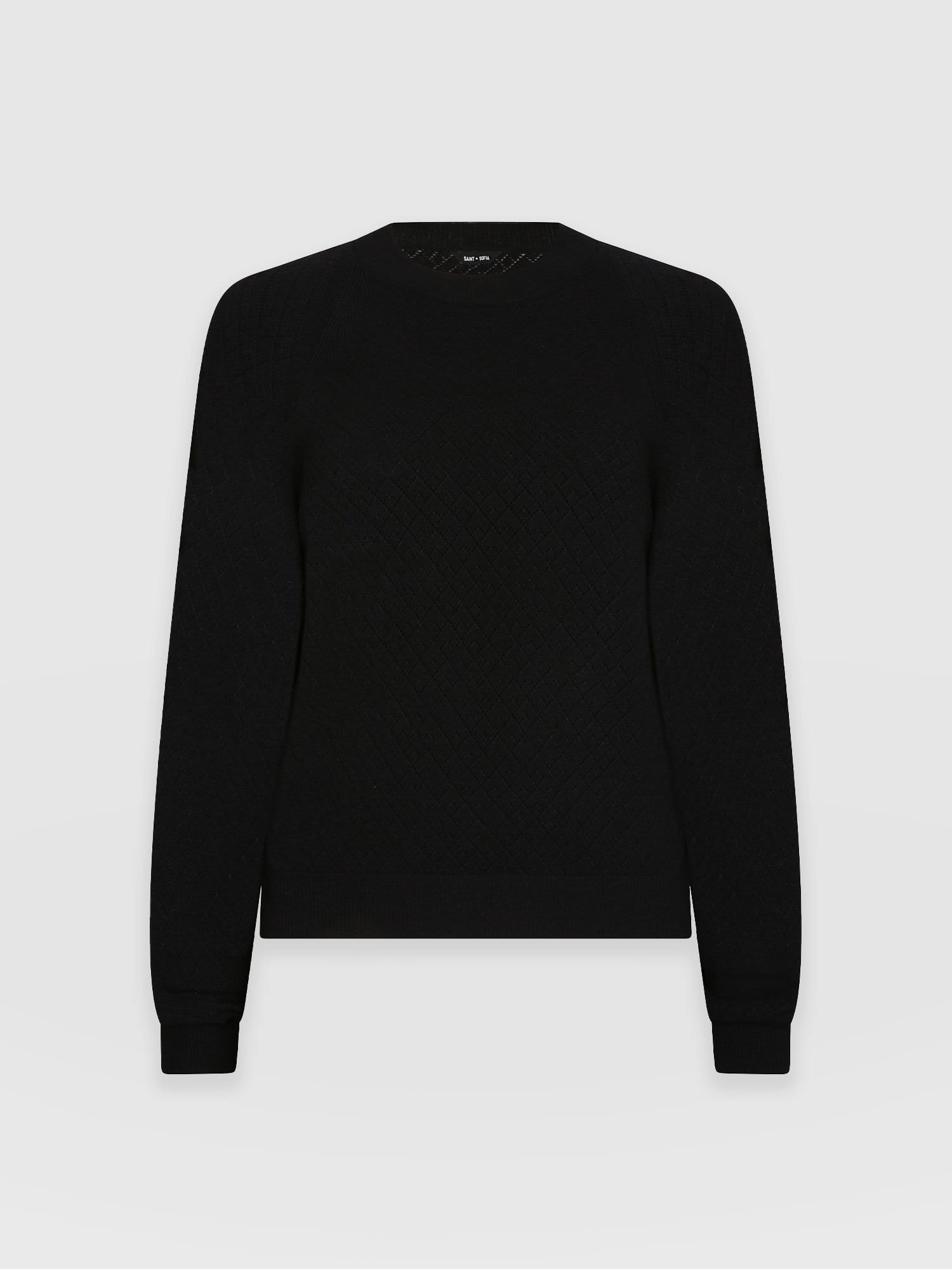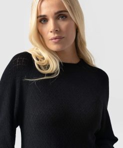 A beautiful, lightweight knitted sweater in black with a diamond lace hole detail. We designed this style to have a slimmer fit with a ribbed collar and long sleeves. Instantly comfortable and made with a soft and smooth eco viscose fabric called Ecovero™. Each style is handmade in our studios in Europe and finished with discrete stitching. Wear it for work with pants or with jeans for a more casual look on a weekend.
