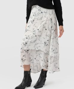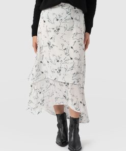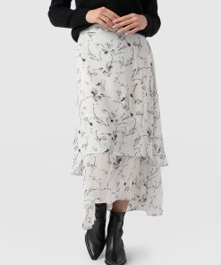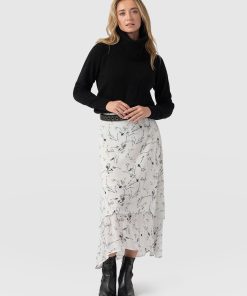 The Etta Layered Skirt in White Floral is made for moments of effortless elegance. It features a two-tiered midi design crafted from lightweight georgette fabric that creates a serenely graceful flow. The elasticated waistband at the back ensures a secure fit, while the flat front adds a polished touch. Style it with the Rib Cami, a pair of Sutton Slides, and the Molten Disc necklace for an elevated look.