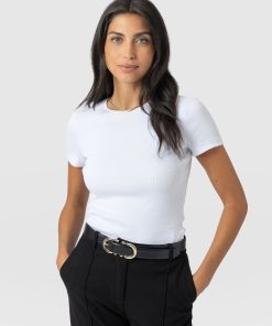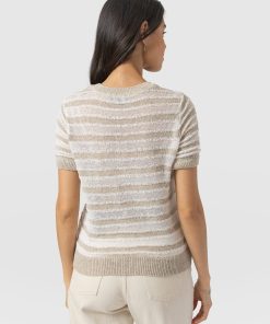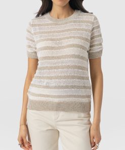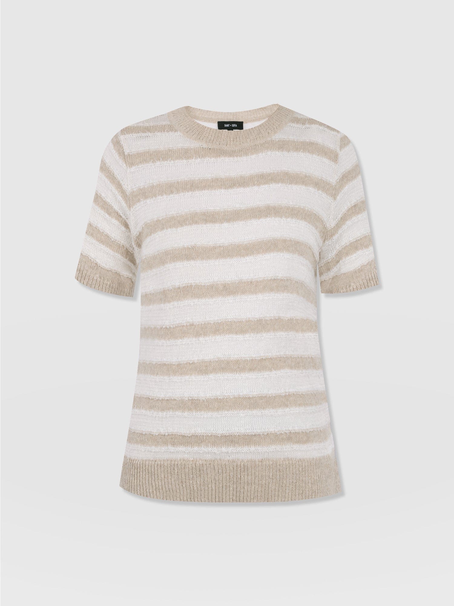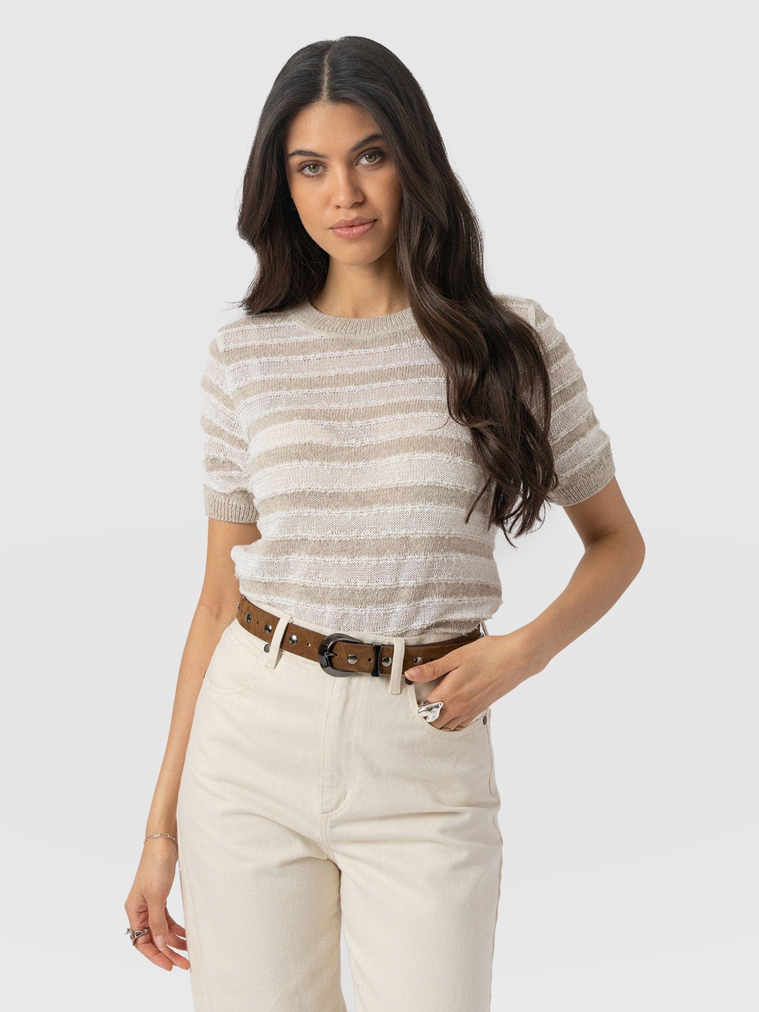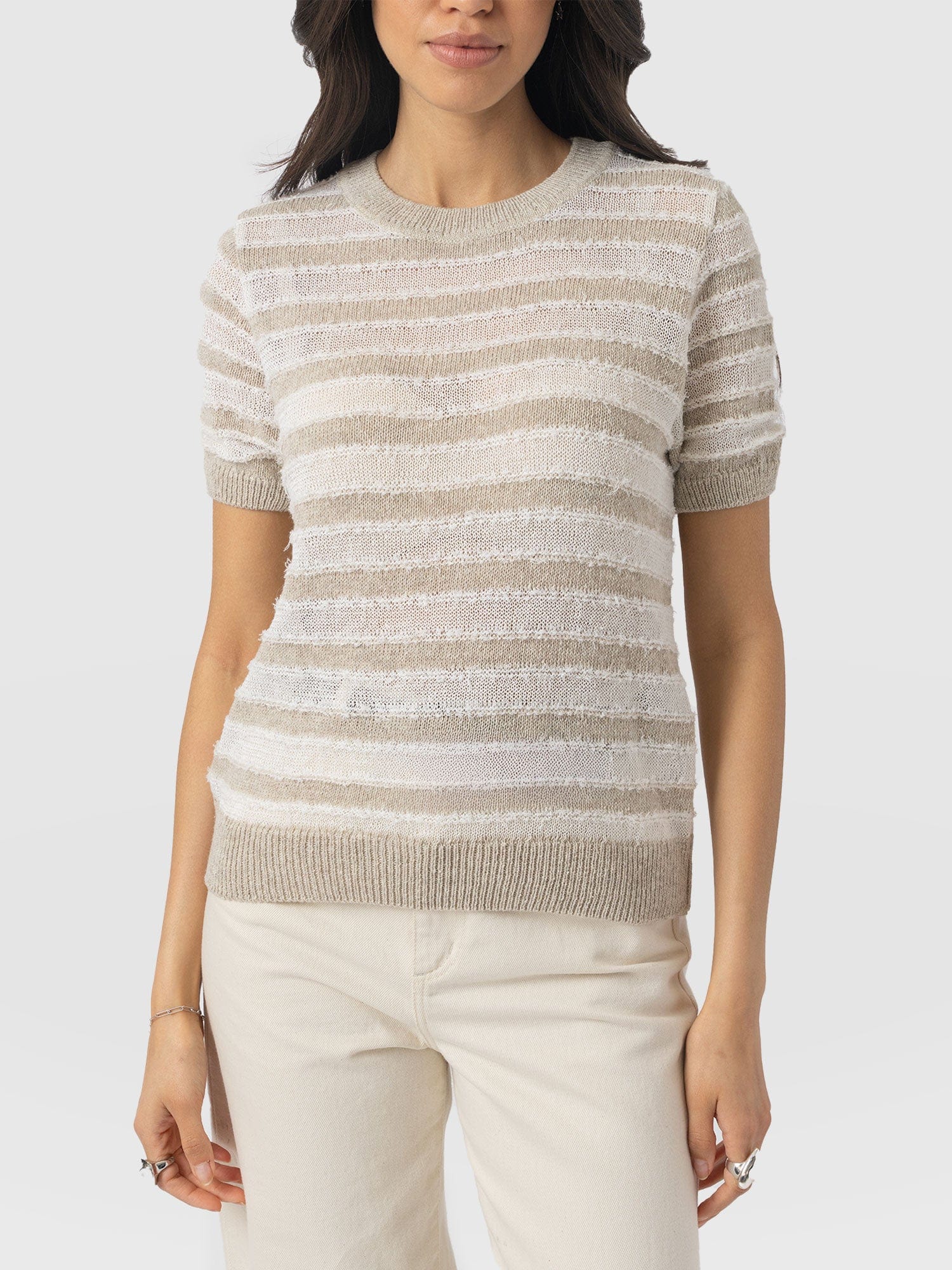 The Fearne Knit Tee is a casual classic. This lightweight knit is shaped into a classic crew-neck but handmade with comfortable soft fibres of wool and silk. It offers an elevated take on the traditional tee. The design features gently ribbed cuffs for a warming look and textured stripes across the bodice for a unique look. Style yours with black Maeve Pants and boots for a style with a contemporary edge.