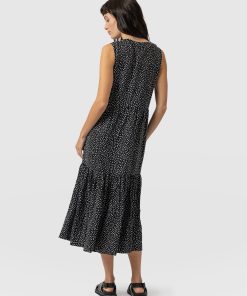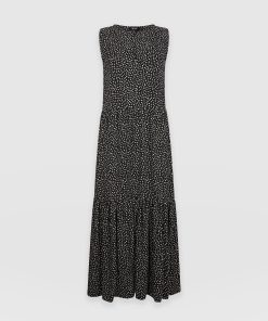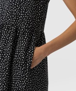 A comfortable, tiered midi dress with a timeless spot pattern. Made with the softest Tencel fabric for an easy look and feel for all the seasons. We designed this style with flattering tiers and used a soft and sustainable Tencel fabric with a beautiful drape. We have added a button closure at the neckline that can be worn open or closed as shown on the model. It has a soft and silky hand feel with a relaxed fit. Wear on its own in the summer or layer with a leather jacket for colder days. Looks great with sneakers or boots in the winter and with heels for a smarter look for work or nights out. (And yes, it has pockets)