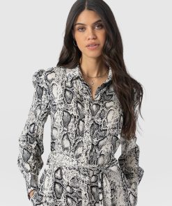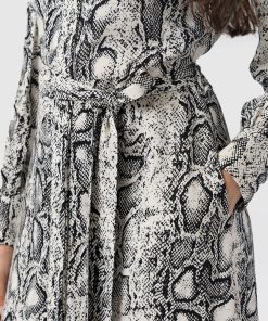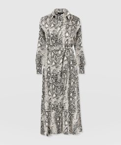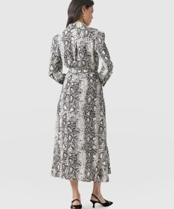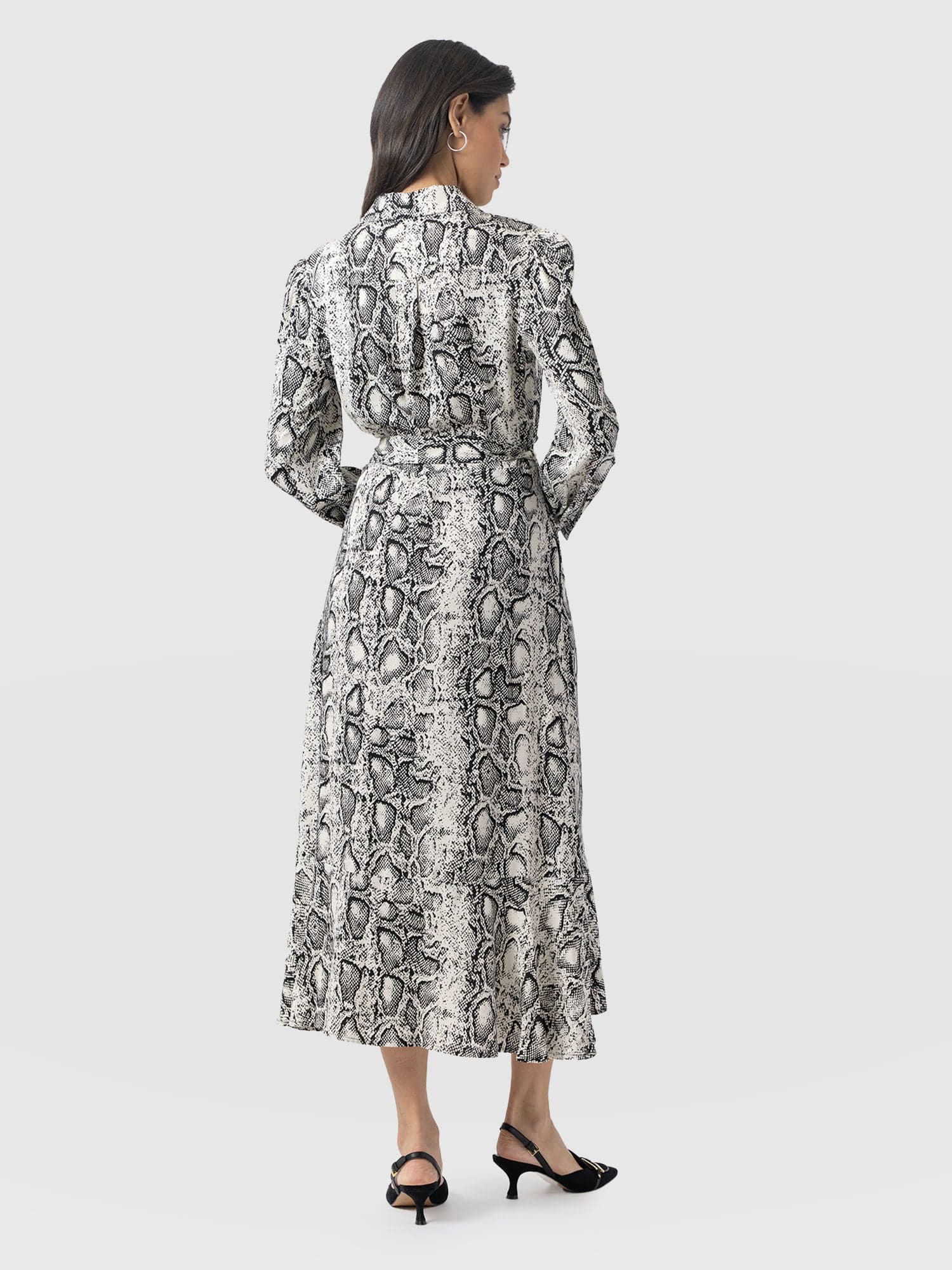 A collared shirt dress in our new Cream Snake print, the Jacqueline dress is made from lightweight viscose and designed with office days and evenings out in mind. The long sleeves, elegant skirt, and belted waist create a sophisticated finish, while the gunmetal buttons add a hint of attitude. We’ve added hidden pockets to the skirt to ensure this midi is a practical choice for every occasion. Slip it on with chunky boots and a trench coat in the winter or with silver jewellery and sandals on warmer days.