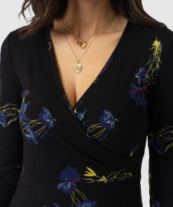 The Maggie Wrap Dress is a beautiful midi cloaked in our floral Blue Lily Gardens print and handmade by artisans in Europe who use a soft and sustainable eco-viscose. This chic style features a skin-baring V-neckline mock wrap and a full A-line skirt. Thanks to its long sleeves, it’s perfect for styling all year round; slip yours on in the summer with trainers and in the winter with a jacket, tights, and boots.