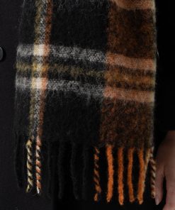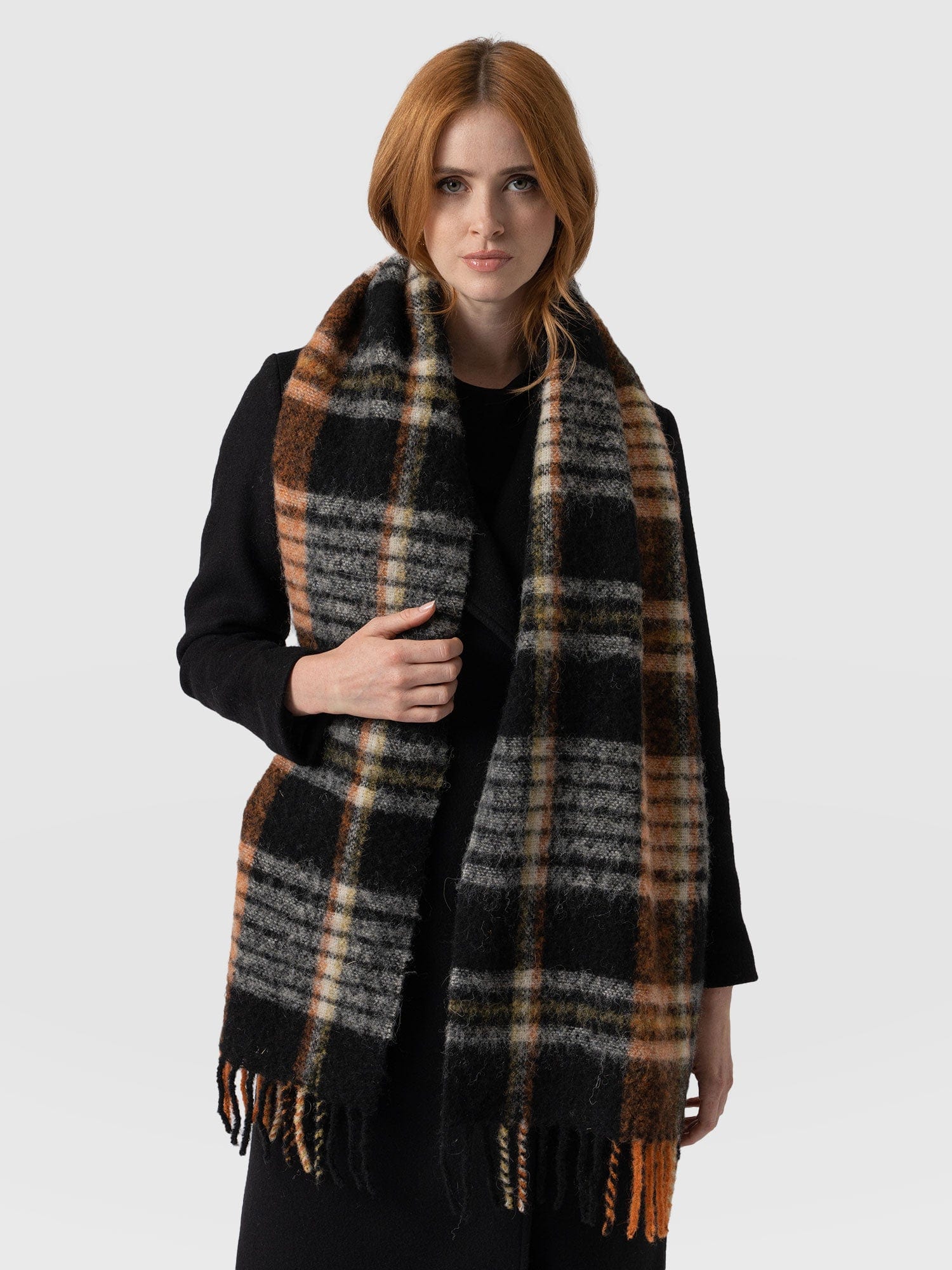 The Nora Check Scarf in Black, Cream, and Orange check is a fluffy checked scarf that is the perfect accessory to elevate your winter look. Its bold design adds a pop of colour and texture to your outfit, making it an ideal complement to our new outerwear collection. Each one is handmade using the softest wool on the shores of Lake Como in Italy.