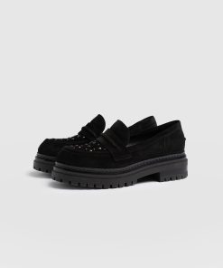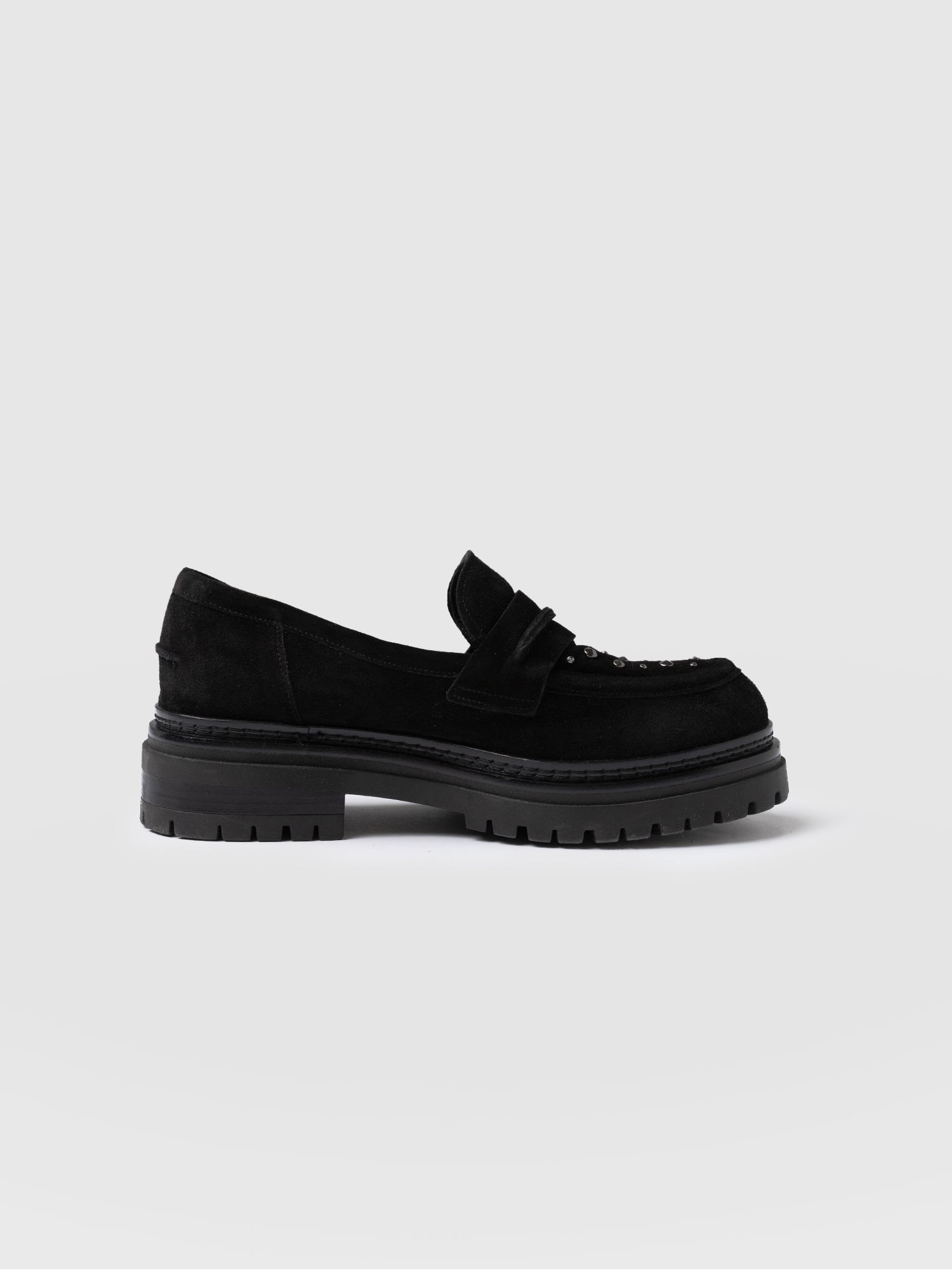 Handmade in Italy using the finest suede, the Raine Loafers in black are a classic pair to add to any wardrobe. Their chunky sole makes them perfect for creating looks with attitude, while the soft feel provides instantly comfortable wear. Plus, the hexagonal stud details that glitter the front help to add a touch of sparkle to everyday styles. Slip into them with jeans, skirts, or dresses – the choice is yours.