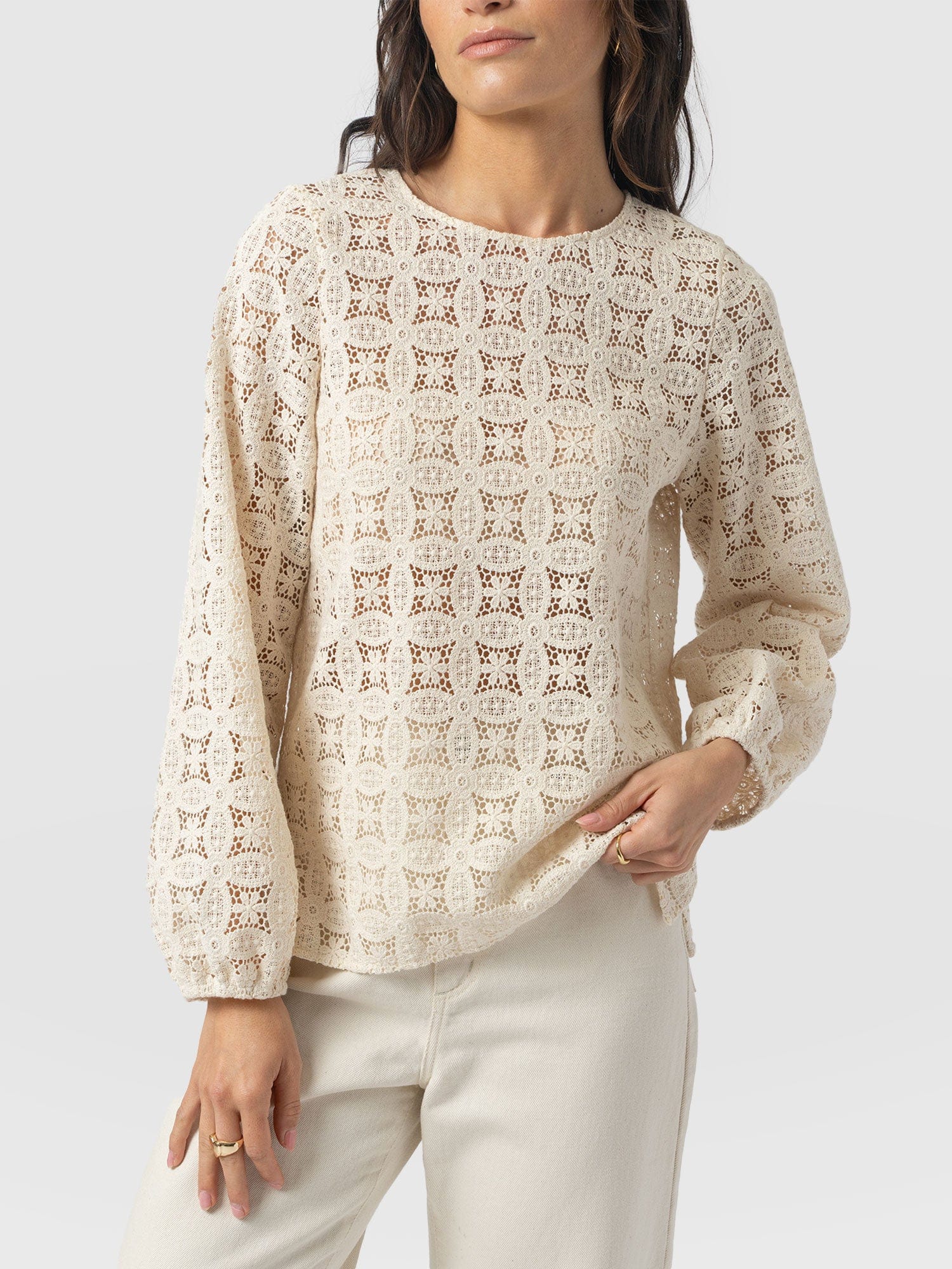 Introducing the Sadie Blouse. This relaxed design is structured to an easy pull-over construction and features a classic crew neckline with long balloon sleeves that cinch at the cuffs. As for the material, that’s 100% organic cotton, which has been masterfully stitched into a broderie anglaise effect and finished by hand for the highest quality. Wear yours with our Barrel Leg Jeans and espadrille pumps to complete the resort-ready aesthetic.