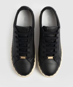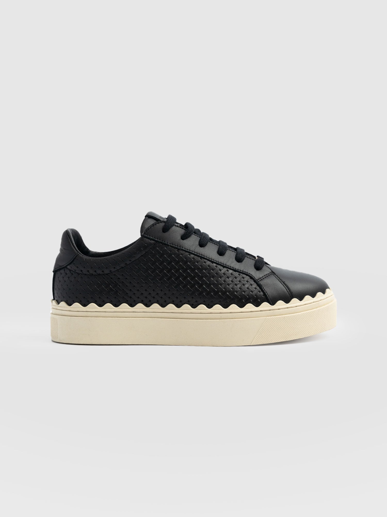 Introducing the Scallop Sneaker, a classic pair of black leather trainers with a contemporary platform sole and textured design. This easy-to-wear style is designed in our London atelier and handmade using Portuguese leather in our Europe studios. They’re shaped to a low-rise silhouette with a round toe and a scalloped trim that adds an elegant twist. But for a final flourish, they’re decorated with a woven side panel that adds a touch of interest to your daily looks.