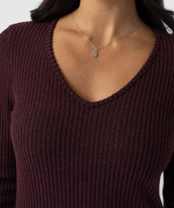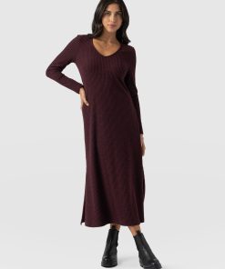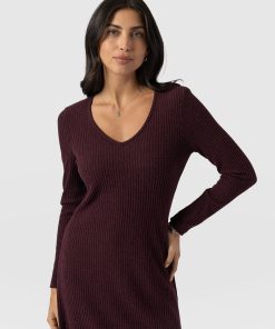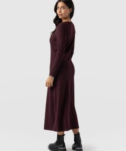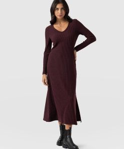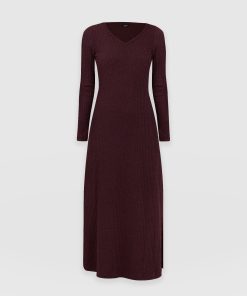 Handmade from a beautifully soft knit, the Sienna Dress in burgundy features a gentle V-neckline, long sleeves, and a midi-length skirt that falls to soft pleats. Its warming aesthetic is only elevated further by a ribbed texture that creates a relaxed finish. As for the fit, this style is designed to sculpt your figure and hug close to your frame while the added elastane provides a comfortable stretch.