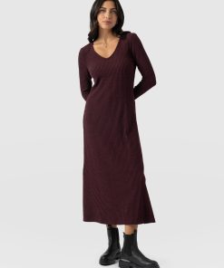 Handmade from a beautifully soft knit, the Sienna Dress in burgundy features a gentle V-neckline, long sleeves, and a midi-length skirt that falls to soft pleats. Its warming aesthetic is only elevated further by a ribbed texture that creates a relaxed finish. As for the fit, this style is designed to sculpt your figure and hug close to your frame while the added elastane provides a comfortable stretch.