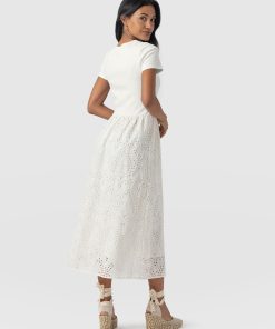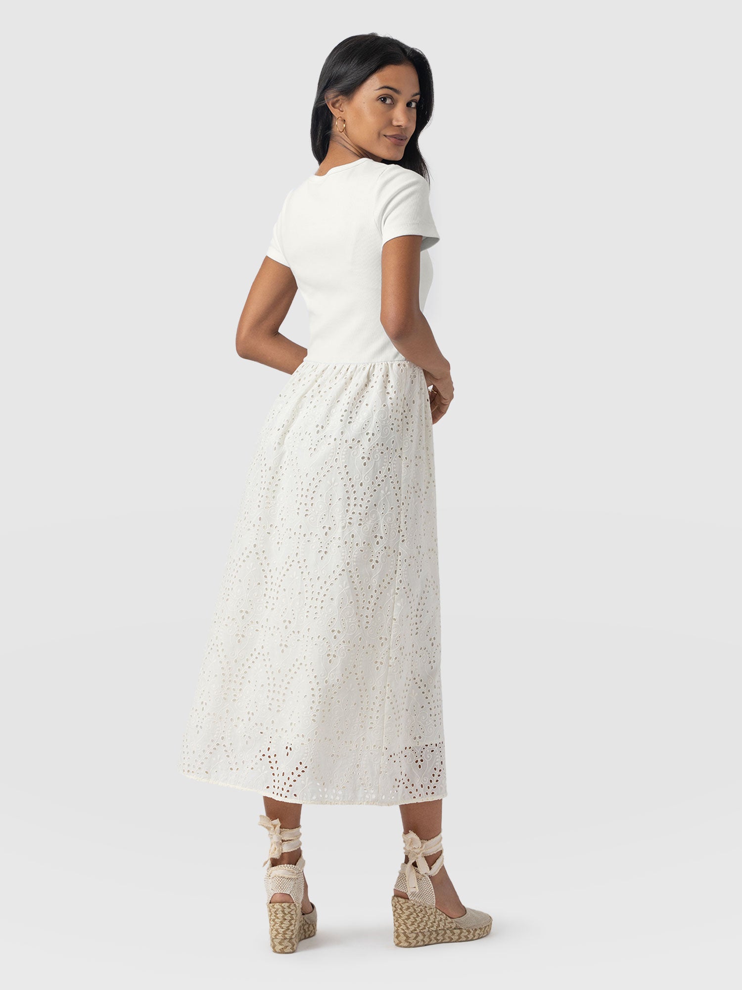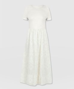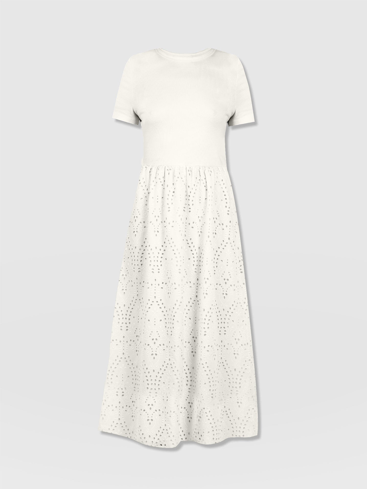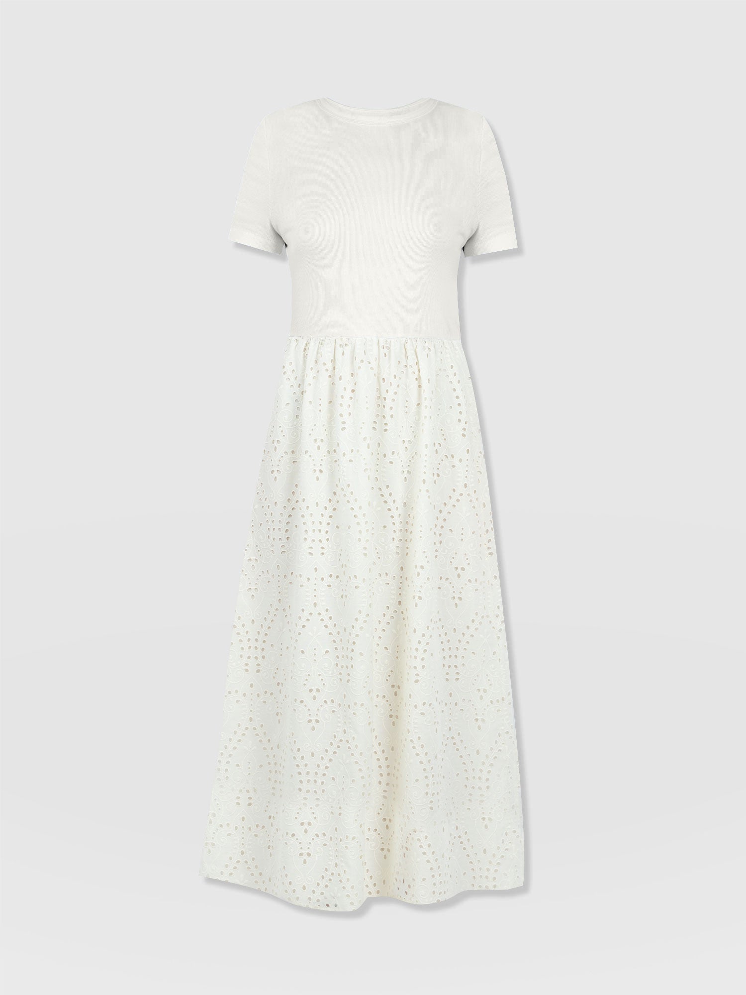 A co-ord effect midi dress. The Sophia Contrast Dress in white is handmade using a soft and smooth short-sleeve jersey bodice against a delicately detailed broderie anglaise skirt. Designed in London, this statement piece is perfect for styling with our Bridget Sling Back Heels and a jacket of your choosing.