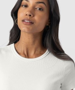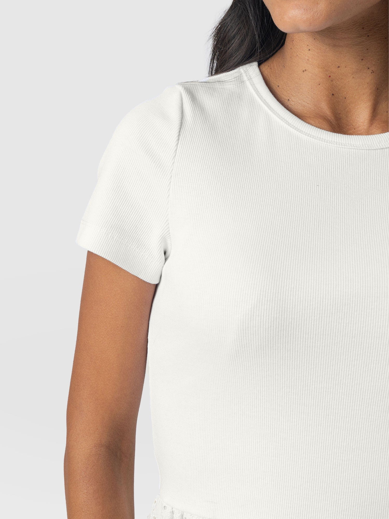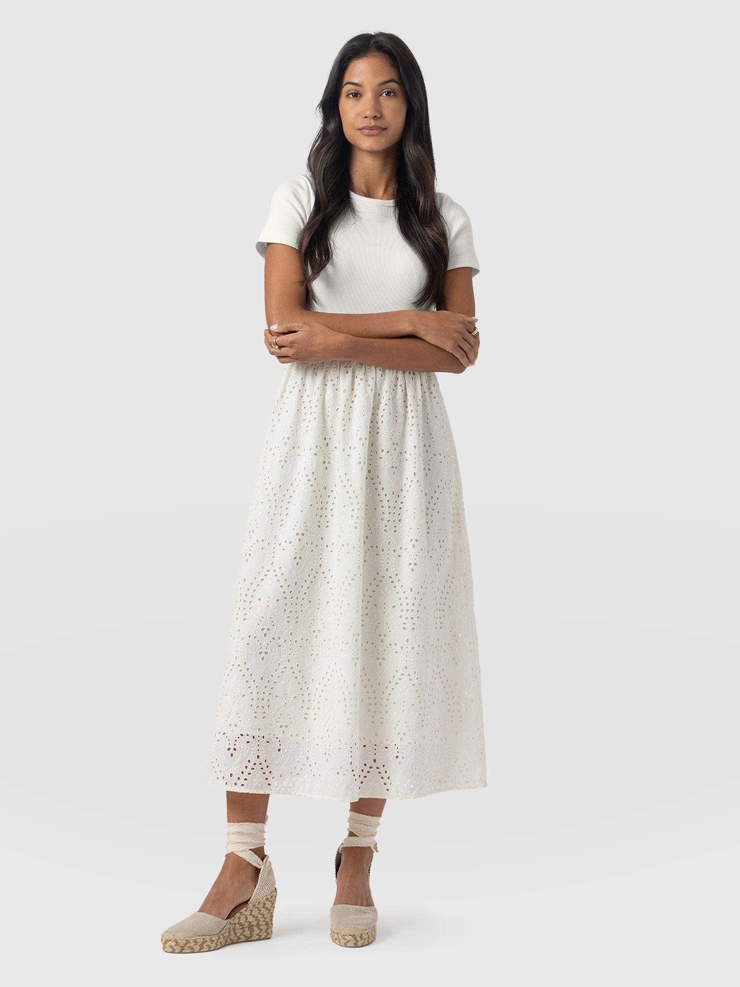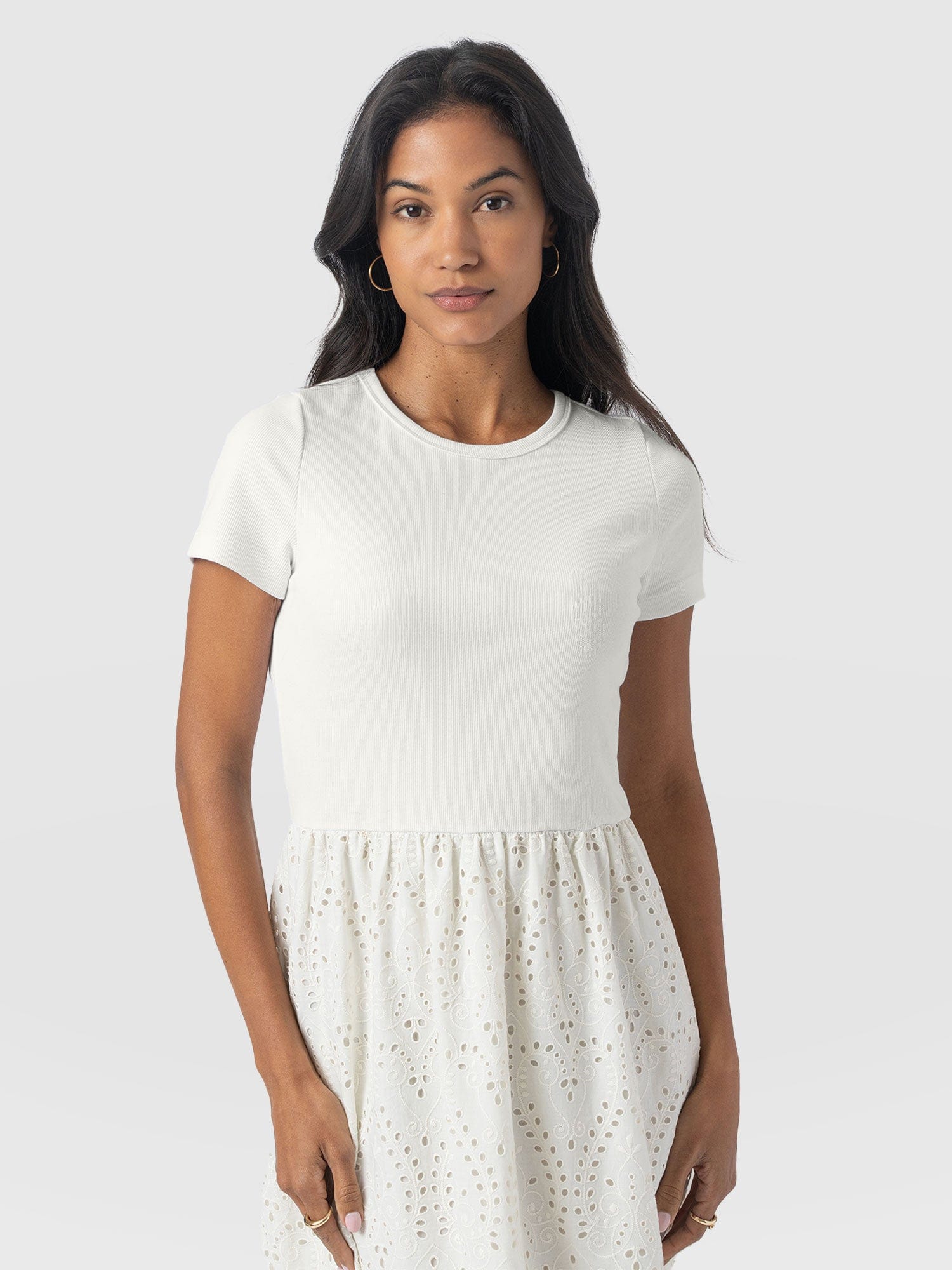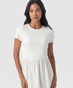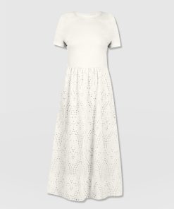 A co-ord effect midi dress. The Sophia Contrast Dress in white is handmade using a soft and smooth short-sleeve jersey bodice against a delicately detailed broderie anglaise skirt. Designed in London, this statement piece is perfect for styling with our Bridget Sling Back Heels and a jacket of your choosing.