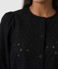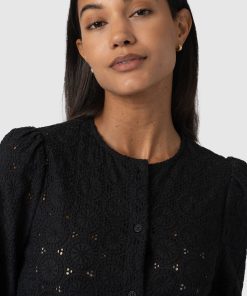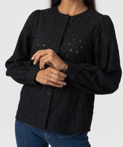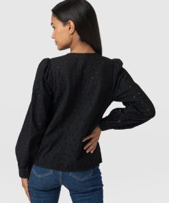 With puff sleeves and a delicate broderie anglaise texture, the Tabitha Blouse in black becomes a beautifully feminine design to add to your wardrobe. It’s masterfully handmade by our skilled artisans in Europe using an organic cotton blend and shaped to a relaxed button-up shirt silhouette with a classic crew neckline. Finished with buttoned cuffs and pearlescent fastenings, it exudes elegance. Wear yours with jeans by day and pants with heels by night.