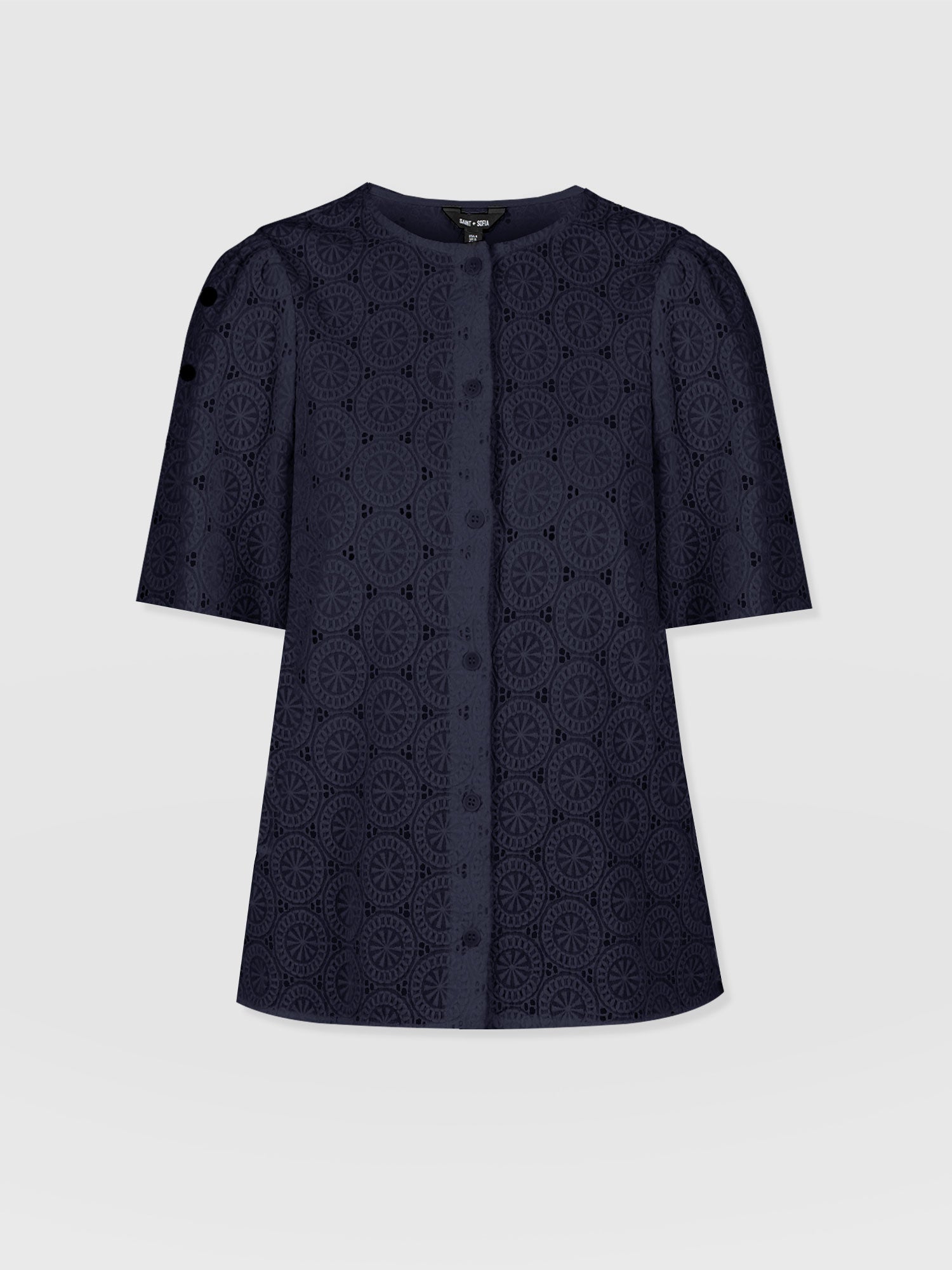 A short-sleeve blouse that’s perfect for any occasion. The Tabitha Blouse in Navy is masterfully handmade using organic cotton and shaped to a classic button-up shirt style. The neckline forgoes the traditional collar for a more casual crew neck while the lightly puffed sleeves add a hint of elegance. And to tie everything together with a beautifully chic finish, it’s decorated in broderie anglaise for a semi-sheer look.