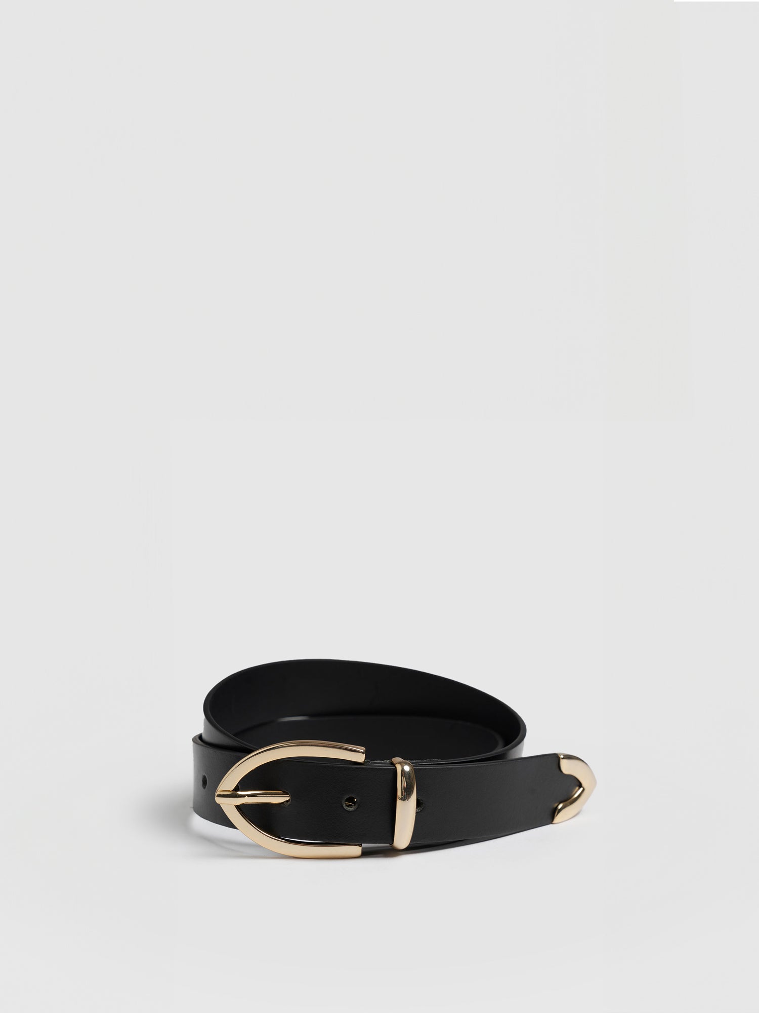 A classic black belt influenced by the American West. Fitted with a V-shaped buckle and belt end detail in light gold toned hardware. Hand made in Italy with the finest, natural leather. The adjustable length can be worn with jeans or pants or to add some flair to any dress.