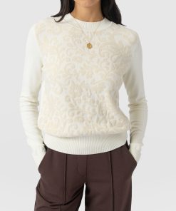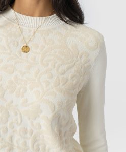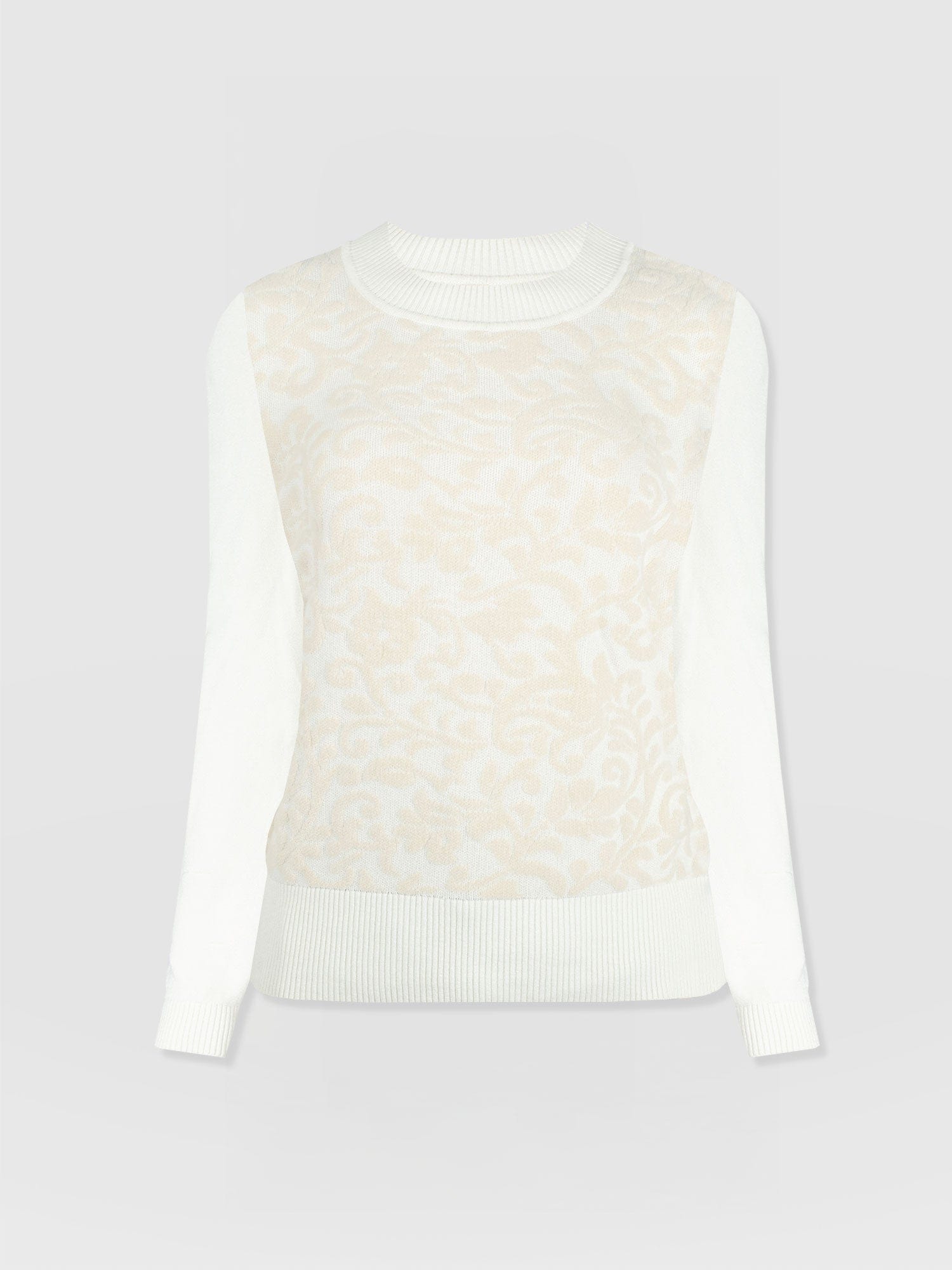 Introducing: The Wren Long Sleeve Knit, the ultimate A/W wardrobe staple. This cream design features a sweater vest-inspired bodice with a floral jacquard finish complete with slim-fitting long sleeves for a layered look. It’s handmade from sumptuously smooth cotton yarn and infused with a hint of stretch for all-day comfort. Style yours with wide-leg trousers or over skirts for a seasonal look.