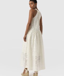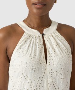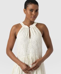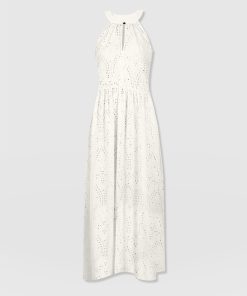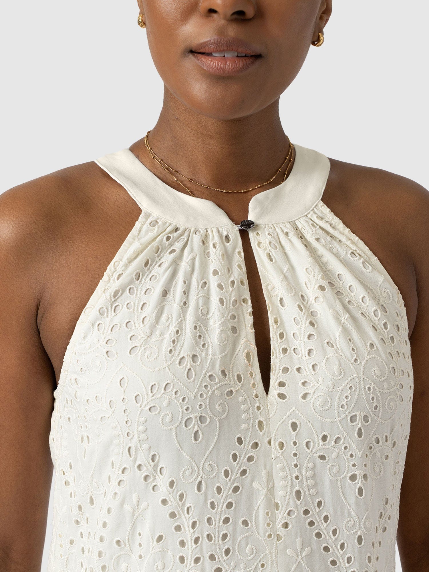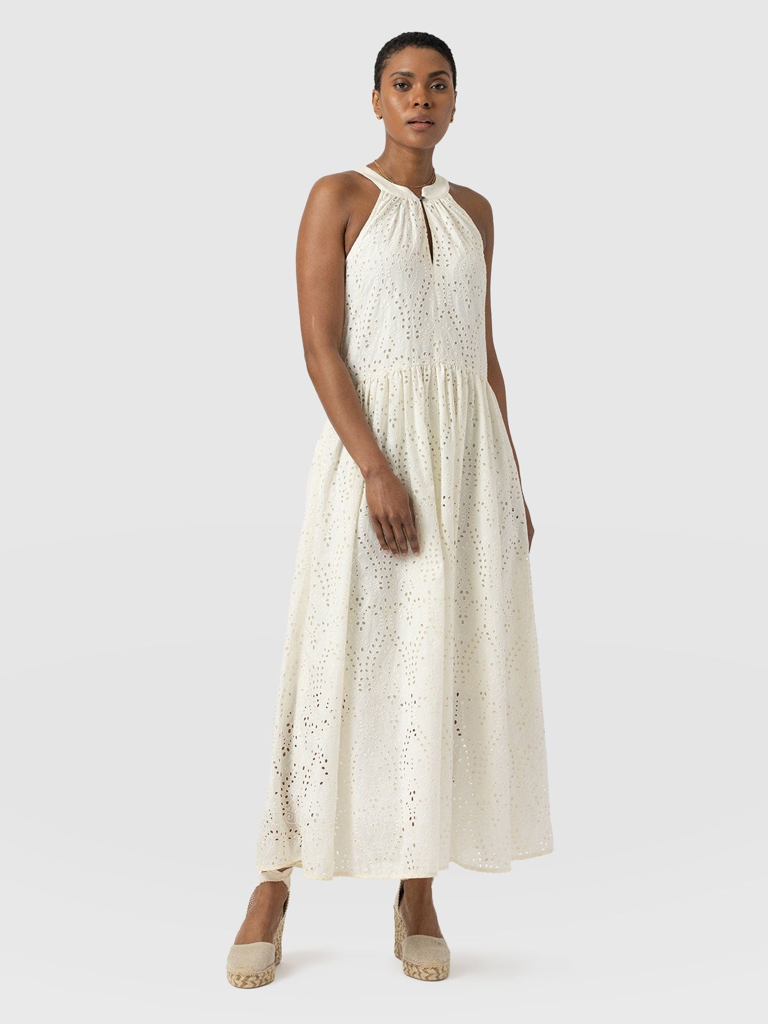 It doesn’t get more elegant than our Zoey Halter Neck Dress in white. This beautiful design is handmade by our skilled artisans in Europe using an organic cotton blend and is delicately detailed with broderie anglaise. The halterneck bodice features a slim cut-out at the chest before falling into a maxi-length skirt that hangs in gentle pleats. Pair yours with the Bridget Sling Back Heels to complete the look.